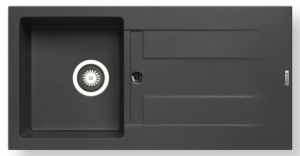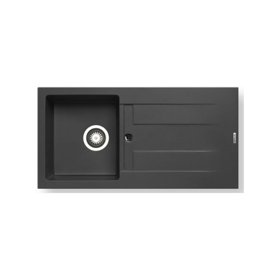 Ένθετος νεροχύτης γρανίτη, μία γούρνα και ποδιά αντιστρεφόμενος, PYRAMIS μοντέλο: Pyragranite Athlos (86x43,5) 1B 1D χρώματος Carbon . Διατίθεται επίσης σε Beige, Mocha και Snow χρωματισμούς. Οι νεροχύτες PYRAMIS Pyragranite αποτελούνται από 80% κρυστάλλους φυσικού γρανίτη (silica), ενώ το υπόλοιπο 20% του μείγματος αποτελείται από ρητίνες και άλλες ουσίες που βοηθούν στη σύνδεση των κρυστάλλων, ώστε ο νεροχύτης να παραμένει αναλλοίωτος για μια ζωή.