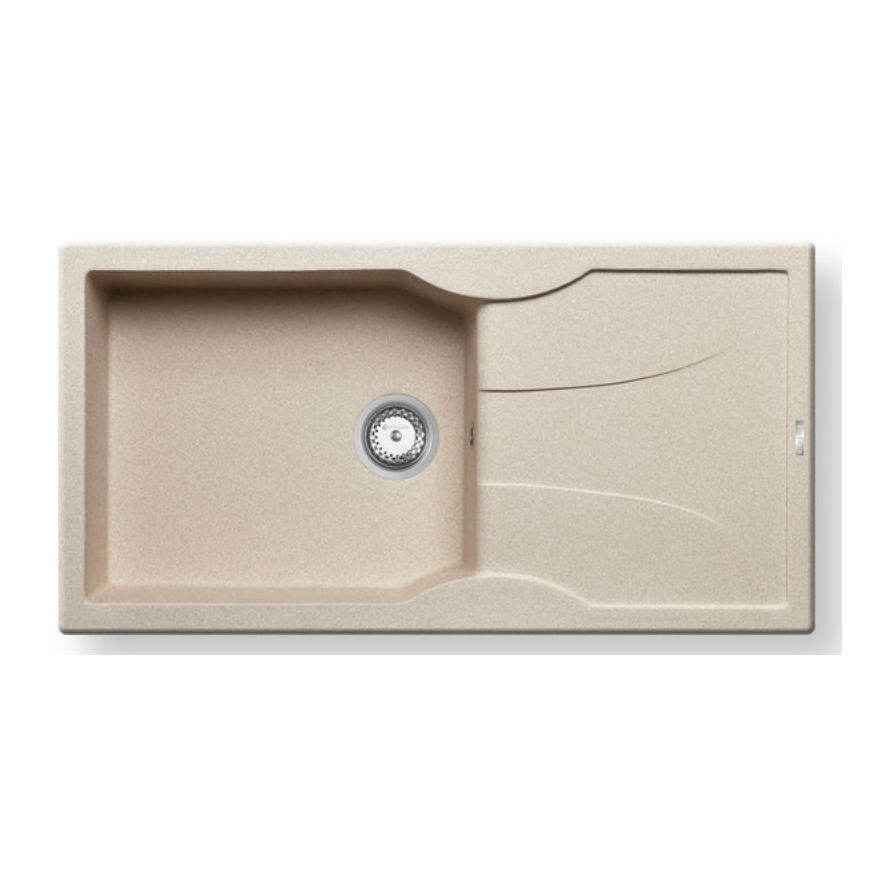 Ένθετος νεροχύτης συνθετικός, μία γούρνα και ποδιά αντιστρεφόμενος, PYRAMIS μοντέλο: Pyratek Aeolia (96x50) 1B 1D χρώματος Grano. Διατίθεται επίσης σε Cristalo Bianco και Chabagne χρωματισμούς. Οι νεροχύτες Pyrateκ αποτελούνται από 70% ανθρακικό ασβέστιο (CaCO3) ενώ, το υπόλοιπο 30% του μείγματος αποτελείται από ρητίνες και άλλες ουσίες που συνθέτουν ένα συμπαγές υλικό, ώστε ο νεροχύτης να παραμένει αναλλοίωτος για μια ζωή.