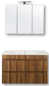 Έπιπλο μπάνιου σετ με συρτάρι MARTIN της σειράς FIESTA μοντέλο WALNUT 90. Κρεμαστή βάση επίπλου, με δυο ευρύχωρα συρτάρια για αποθηκευτικό χώρο, νιπτήρας πορσελάνης, καθρέπτης κρεμαστός και φωτιστικό. Η σειρά επίπλων μπάνιου FIESTA ακολουθεί τη λογική hand-less και ενσωματώνει όλες τις σύγχρονες τάσεις στο σχεδιασμό επίπλων μπάνιου. Τα έπιπλα μπάνιου χωρίς πόμολα προσφέρουν δημιουργικές λύσεις και απαντούν στην ανάγκη για ένα μπάνιο με νεανική αύρα.