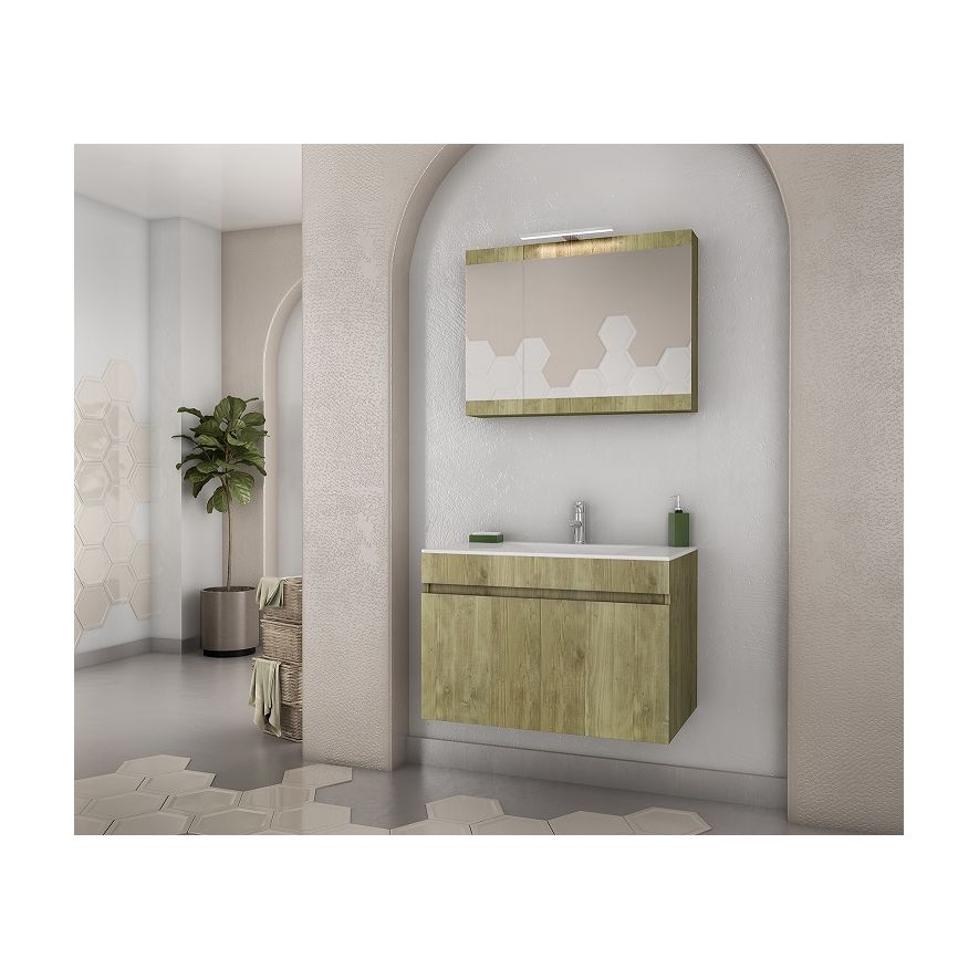 Έπιπλο μπάνιου Drop της σειράς Economic μοντέλο MAGNOLIA 75 Gold Oak. Κρεμαστή βάση επίπλου, ενιαίος αποθηκευτικός χώρος δύο πόρτες, νιπτήρας πορσελάνης προφίλ 2 cm, καθρέπτης κρεμαστός από μελαμίνη Gold Oak, φωτιστικό led. Κομψότητα με στυλ. Μοντέρνες λύσεις που ξεχωρίζουν, για ένα μπάνιο με προσωπικότητα.