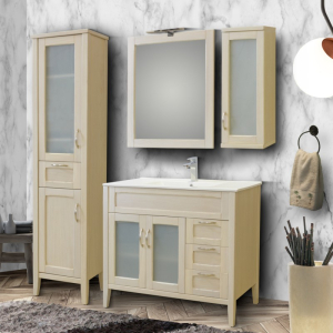 Έπιπλο μπάνιου σετ από μασίφ ξύλο οξιάς MARTIN της σειράς ARETOUSA BEIZE 100. Επιδαπέδια βάση επίπλου, με ενιαίο αποθηκευτικό χώρο, δυο πορτάκια και τρία συρτάρια, νιπτήρας πορσελάνης, καθρέπτης κρεμαστός και φωτιστικό. Χειροποίητο κλασικό έπιπλο μπάνιου που δίνει αίγλη και χαρίζει εκλεκτή ποιότητα και αντοχή. Ελληνικής δημιουργίας. Η κατασκευή γίνεται κατόπιν παραγγελίας, με χρόνο παράδοσης περίπου δέκα ημέρων.
