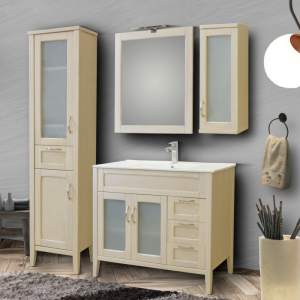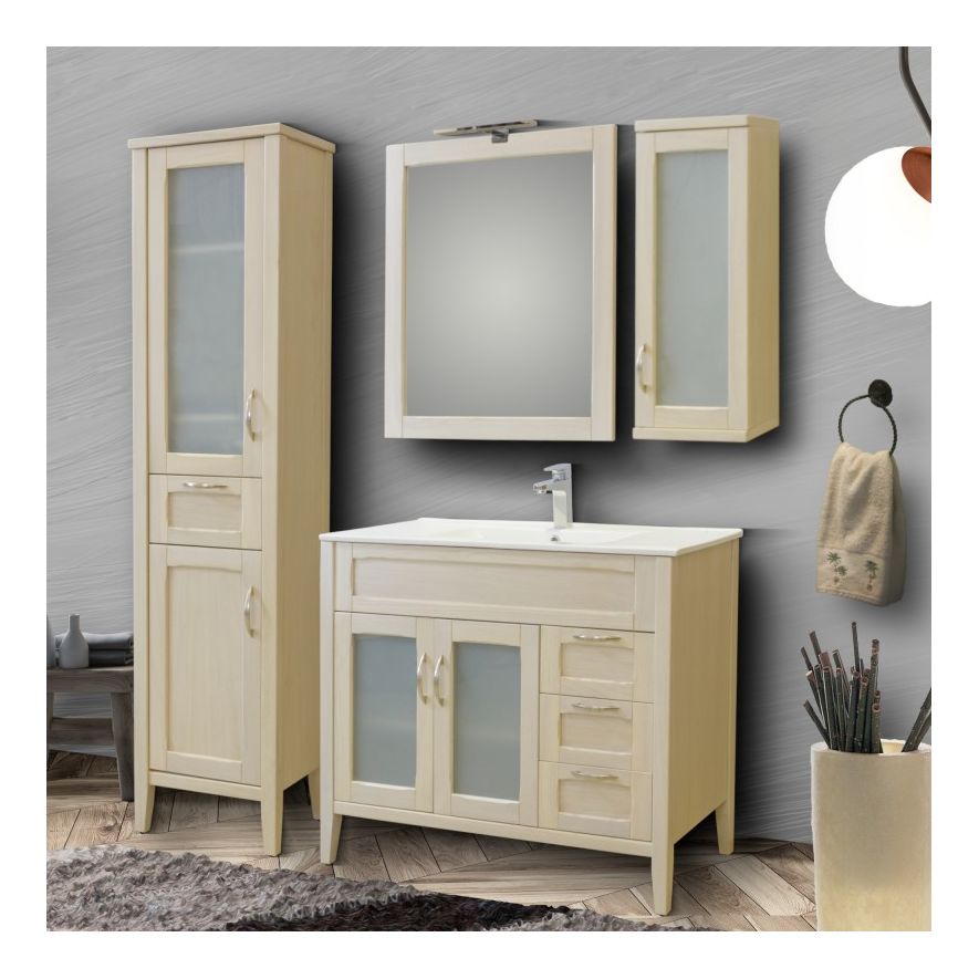 Έπιπλο μπάνιου σετ από μασίφ ξύλο οξιάς MARTIN της σειράς ARETOUSA BEIZE 90. Επιδαπέδια βάση επίπλου, με ενιαίο αποθηκευτικό χώρο, δυο πορτάκια και τρία συρτάρια, νιπτήρας πορσελάνης, καθρέπτης κρεμαστός και φωτιστικό. Χειροποίητο κλασικό έπιπλο μπάνιου που δίνει αίγλη και χαρίζει εκλεκτή ποιότητα και αντοχή. Ελληνικής δημιουργίας. Η κατασκευή γίνεται κατόπιν παραγγελίας, με χρόνο παράδοσης περίπου δέκα ημέρων.