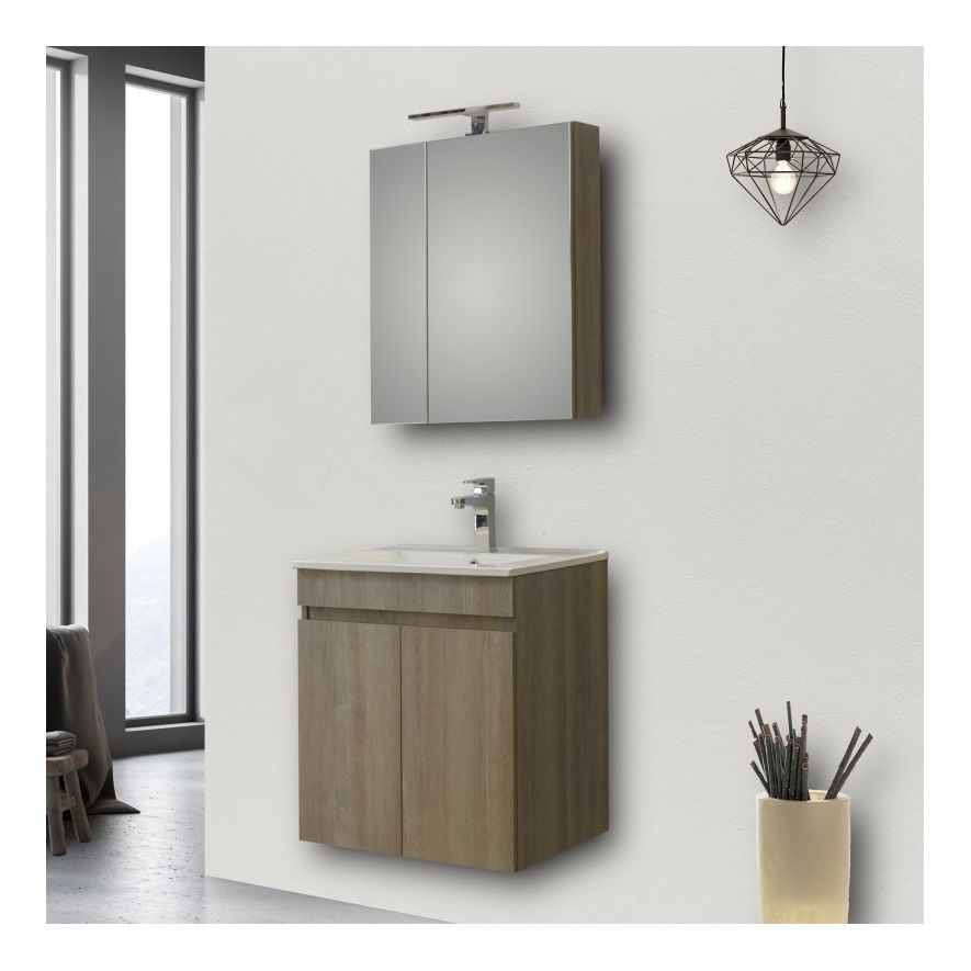 Μοντέρνο έπιπλο μπάνιου σετ της MARTIN σειρά OMEGA μοντέλο GREY OAK 50. Κρεμαστή βάση επίπλου, με ενιαίους αποθηκευτικούς χώρους, νιπτήρας πορσελάνης, καθρέπτης κρεμαστός και φωτιστικό. Η σύνθεση Omega εκφράζει την τέλεια αντίθεση πολυτελούς και απλού. Η σειρά Omega ακολουθεί τη σύγχρονη λογική των επίπλων χωρίς πόμολα προσφέροντας έναν κόσμο εργονομίας και δημιουργικών λύσεων.