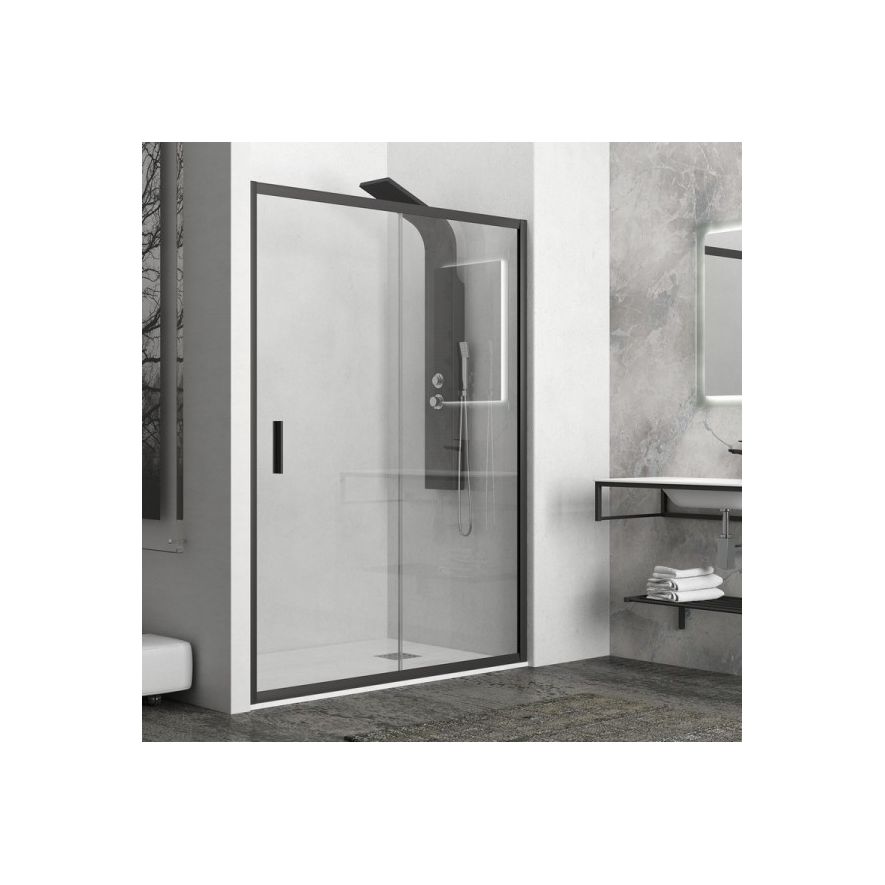 Καμπίνα ντουζιέρας από τοίχο σε τοίχο, ευθύγραμμη - πόρτα, Karag μοντέλο EFE 500 NERO, 140 x h 190 cm, κρύσταλλο ασφαλείας 5 mm Tempered διαφανές, μεταλλικά μέρη προφίλ ανοδιωμένου αλουμινίου μαύρο.