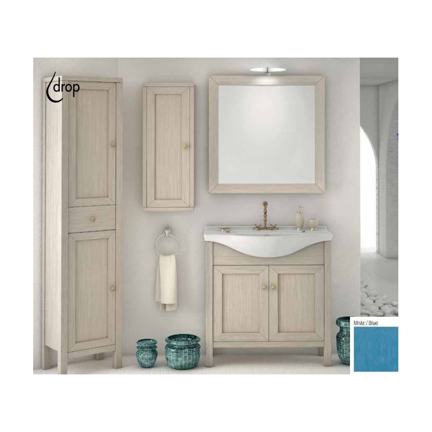 Έπιπλο μπάνιου Drop της σειράς Classic μοντέλο NAFSIKA 75 BLUE 75cm & Mirror Wall. Επιδαπέδια βάση επίπλου, ενιαίος αποθηκευτικός χώρος δύο πόρτες, νιπτήρας πορσελάνης Monoblock, καθρέπτης κρεμαστός με πλαίσιο από Ξύλο Βελανιδιάς BLUE και ένα φωτιστικό. Μοντέρνες λύσεις που ξεχωρίζουν, για ένα μπάνιο με προσωπικότητα. Η επιδαπέδια στήλη, το κρεμαστό ερμάριο, η μπαταρία και τα αξεσουάρ μπάνιου δεν συμπεριλαμβάνονται στην τιμή