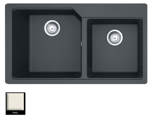 Ένθετος νεροχύτης ορυκτού γρανίτη με δύο ασύμμετρες γούρνες χωρίς ποδιά, Carron Phoenix μοντέλο: ARUBA 6205 Ivory 86x50 cm. Διατίθεται επιπλέον σε αποχρώσεις Graphite, Black, Beige, Oyster, White, Cappuccino, Espresso & Silver Stone Metallic. Μια πλήρης γκάμα νεροχυτών, που διακρίνονται για την εξαιρετική τους αντοχή, την υψηλή ποιότητα και τα φυσικά χρώματα, συνδυάζουν άψογα την κομψότητα και την εργονομία.