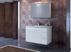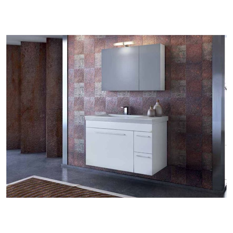 Έπιπλο μπάνιου Drop της σειράς Elegance μοντέλο STATUS 85 White 85cm. Κρεμαστή βάση επίπλου, δύο αποθηκευτικοί χώροι ανακλινόμενη πόρτα και δύο συρτάρια, νιπτήρας πορσελάνης προφίλ 4 cm, καθρέπτης κρεμαστός ενιαίος αποθηκευτικός χώρος δύο πόρτες από λευκή πολυεστερική γυαλιστερή λάκα και φωτιστικό Led. Κομψότητα με στυλ. Μοντέρνες λύσεις που ξεχωρίζουν, για ένα μπάνιο με προσωπικότητα.