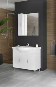 Έπιπλο μπάνιου Drop της σειράς Economic μοντέλο ALBA 100 White 2 100cm. Επιδαπέδια βάση επίπλου, δύο αποθηκευτικοί χώροι τρείς πόρτες, νιπτήρας πορσελάνης Monoblock, καθρέπτης κρεμαστός και κρεμαστό ερμάριο από λευκή γυαλιστερή λάκα. Κομψότητα με στυλ. Μοντέρνες λύσεις που ξεχωρίζουν, για ένα μπάνιο με προσωπικότητα.