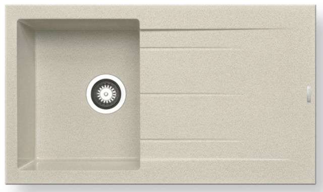 Ένθετος νεροχύτης γρανίτη, μία γούρνα και ποδιά αντιστρεφόμενος, PYRAMIS μοντέλο: Pyragranite Alazia (86x50) 1B 1D χρώματος Beige. Διατίθεται επίσης σε Carbon, Chocolate, Mocha, Snow και Iron Grey χρωματισμούς. Οι νεροχύτες PYRAMIS Pyragranite αποτελούνται από 80% κρυστάλλους φυσικού γρανίτη (silica), ενώ το υπόλοιπο 20% του μείγματος αποτελείται από ρητίνες και άλλες ουσίες που βοηθούν στη σύνδεση των κρυστάλλων, ώστε ο νεροχύτης να παραμένει αναλλοίωτος για μια ζωή.