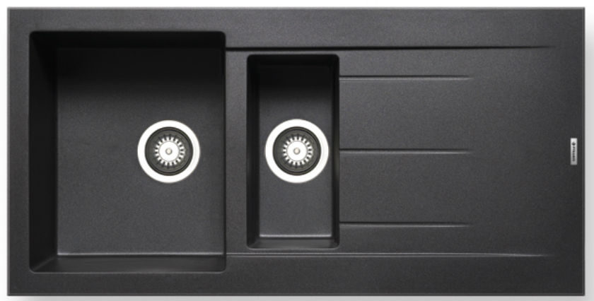 Ένθετος νεροχύτης γρανίτη, μία και μισή γούρνες με ποδιά αντιστρεφόμενος, PYRAMIS μοντέλο: Pyragranite Alazia (100x50) 1 1/2B 1D χρώματος Carbon. Διατίθεται επίσης σε Beige, Chocolate, Mocha, Snow και Iron Grey χρωματισμούς. Οι νεροχύτες PYRAMIS Pyragranite αποτελούνται από 80% κρυστάλλους φυσικού γρανίτη (silica), ενώ το υπόλοιπο 20% του μείγματος αποτελείται από ρητίνες και άλλες ουσίες που βοηθούν στη σύνδεση των κρυστάλλων, ώστε ο νεροχύτης να παραμένει αναλλοίωτος για μια ζωή.