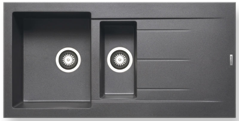 Ένθετος νεροχύτης γρανίτη, μία και μισή γούρνες με ποδιά αντιστρεφόμενος, PYRAMIS μοντέλο: Pyragranite Alazia (100x50) 1 1/2B 1D χρώματος Iron Grey. Διατίθεται επίσης σε Beige, Carbon, Chocolate, Mocha και Snow χρωματισμούς. Οι νεροχύτες PYRAMIS Pyragranite αποτελούνται από 80% κρυστάλλους φυσικού γρανίτη (silica), ενώ το υπόλοιπο 20% του μείγματος αποτελείται από ρητίνες και άλλες ουσίες που βοηθούν στη σύνδεση των κρυστάλλων, ώστε ο νεροχύτης να παραμένει αναλλοίωτος για μια ζωή.