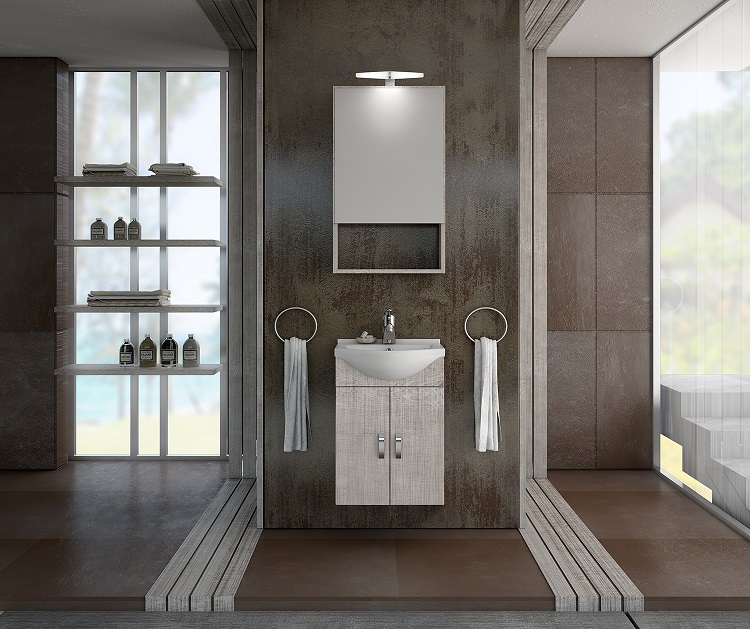 Έπιπλο μπάνιου Drop της σειράς Economic μοντέλο ALBA 45 Elm Wood. Κρεμαστή βάση επίπλου, ενιαίος αποθηκευτικός χώρος δύο πόρτες, νιπτήρας πορσελάνης Monoblock, καθρέπτης κρεμαστός ερμάριο ενιαίος αποθηκευτικός χώρος - μία πόρτα ανοιγόμενη δεξιά ή αριστερά από μελαμίνη Elm Wood και φωτιστικό. Κομψότητα με στυλ. Μοντέρνες λύσεις που ξεχωρίζουν, για ένα μπάνιο με προσωπικότητα.