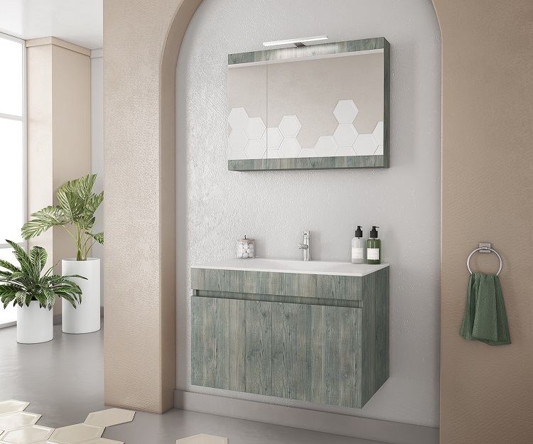 Έπιπλο μπάνιου Drop της σειράς Economic μοντέλο MAGNOLIA 75 Smoked Oak. Κρεμαστή βάση επίπλου, ενιαίος αποθηκευτικός χώρος δύο πόρτες, νιπτήρας πορσελάνης προφίλ 2 cm, καθρέπτης κρεμαστός από μελαμίνη Smoked Oak, φωτιστικό led. Κομψότητα με στυλ. Μοντέρνες λύσεις που ξεχωρίζουν, για ένα μπάνιο με προσωπικότητα.