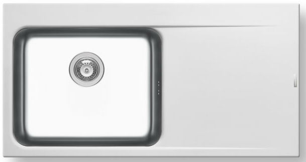 Ένθετος νεροχύτης γρανίτη, μία γούρνα και ποδιά αριστερά, PYRAMIS μοντέλο: Pyragranite & Inox Pyrros (100x52) 1B 1D LH χρώματος Snow. Καινοτομία: Pyragranite μαξιλάρι με ενσωματωμένη ανοξείδωτη γούρνα. Οι νεροχύτες PYRAMIS Pyragranite αποτελούνται από 80% κρυστάλλους φυσικού γρανίτη (silica), ενώ το υπόλοιπο 20% του μείγματος αποτελείται από ρητίνες και άλλες ουσίες που βοηθούν στη σύνδεση των κρυστάλλων, ώστε ο νεροχύτης να παραμένει αναλλοίωτος για μια ζωή.