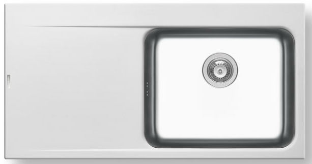 Ένθετος νεροχύτης γρανίτη, μία γούρνα και ποδιά δεξιά, PYRAMIS μοντέλο: Pyragranite & Inox Pyrros (100x52) 1B 1D RH χρώματος Snow. Καινοτομία: Pyragranite μαξιλάρι με ενσωματωμένη ανοξείδωτη γούρνα. Οι νεροχύτες PYRAMIS Pyragranite αποτελούνται από 80% κρυστάλλους φυσικού γρανίτη (silica), ενώ το υπόλοιπο 20% του μείγματος αποτελείται από ρητίνες και άλλες ουσίες που βοηθούν στη σύνδεση των κρυστάλλων, ώστε ο νεροχύτης να παραμένει αναλλοίωτος για μια ζωή.