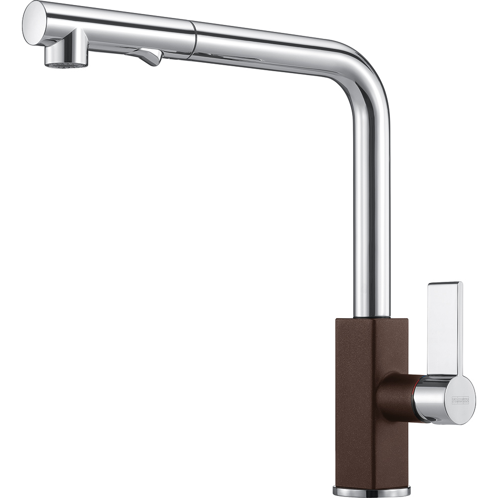 Αναμεικτική μπαταρία κουζίνας με αποσπώμενο ντους, εύκαμπτο σωλήνα άθραυστο σπιράλ και περιστρεφόμενο ρουξούνι 360° της FRANKE μοντέλο: New Maris Ντους Dark Brown. Οι μπαταρίες Franke έχουν κατασκευαστεί με βάση κορυφαία πρότυπα. Η αρμονία του design, των σχημάτων και των υλικών δημιουργούν απαράμιλλη αισθητική, αναδεικνύοντας κάθε κουζίνα.