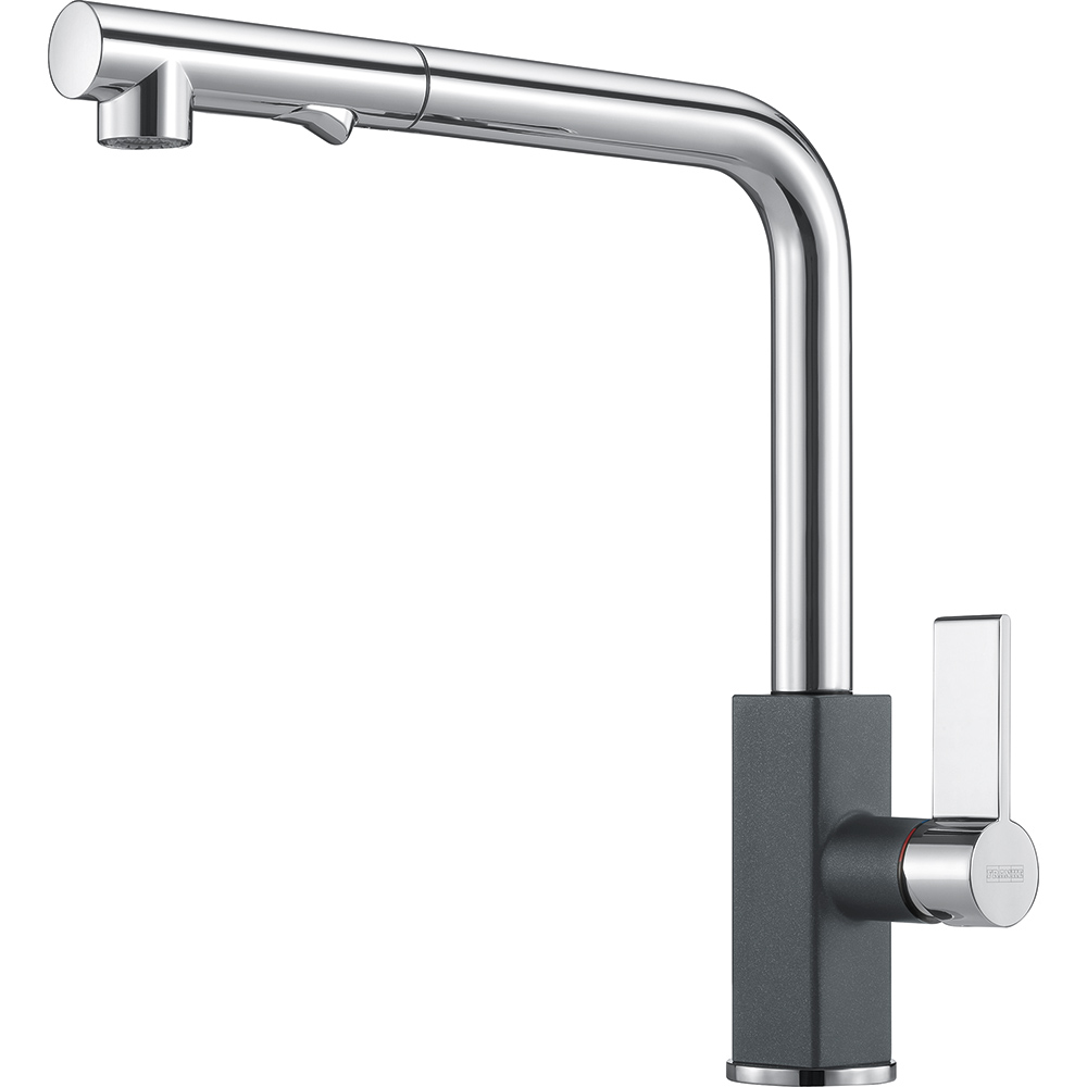 Αναμεικτική μπαταρία κουζίνας με αποσπόμενο ντους, εύκαμπτο σωλήνα άθραυστο σπιράλ αυτόματης επαναφοράς και περιστρεφόμενο ρουξούνι 360° της FRANKE μοντέλο: New Maris Ντους Graphite. Οι μπαταρίες Franke έχουν κατασκευαστεί με βάση κορυφαία πρότυπα. Η αρμονία του design, των σχημάτων και των υλικών δημιουργούν απαράμιλλη αισθητική, αναδεικνύοντας κάθε κουζίνα.