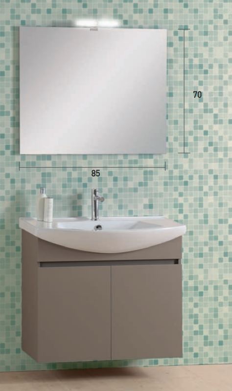 Κρεμαστή βάση επίπλου, αποθηκευτικός χώρος, νιπτήρας πορσελάνης, καθρέπτης κρεμαστός και φωτιστικό.