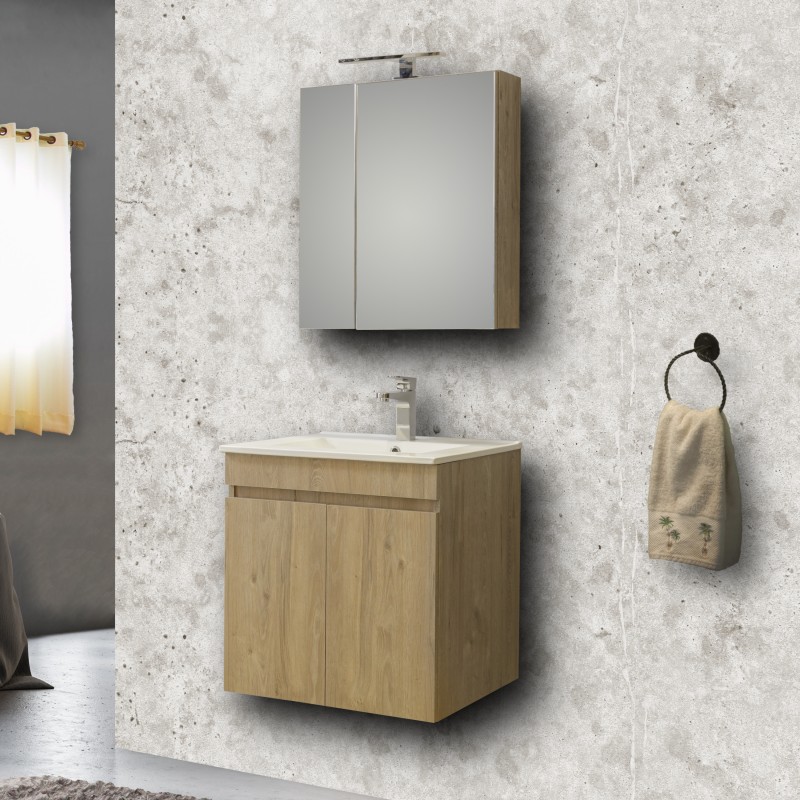 Μοντέρνο έπιπλο μπάνιου σετ της MARTIN σειρά OMEGA μοντέλο BEIGE OAK 60. Κρεμαστή βάση επίπλου, με ενιαίους αποθηκευτικούς χώρους, νιπτήρας πορσελάνης, καθρέπτης κρεμαστός και φωτιστικό. Η σύνθεση Omega εκφράζει την τέλεια αντίθεση πολυτελούς και απλού. Η σειρά Omega ακολουθεί τη σύγχρονη λογική των επίπλων χωρίς πόμολα προσφέροντας έναν κόσμο εργονομίας και δημιουργικών λύσεων.