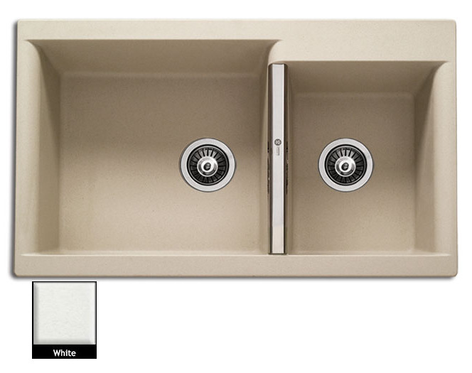 Ένθετος νεροχύτης ορυκτού γρανίτη με δύο ασύμμετρες γούρνες χωρίς ποδιά, Carron Phoenix μοντέλο: JAVA 4205 White 86x51 cm. Διατίθεται επιπλέον σε αποχρώσεις Ivory, Oyster, Espresso, Cappuccino, Silver Stone & Graphite Metallic. Μια πλήρης γκάμα νεροχυτών, που διακρίνονται για την εξαιρετική τους αντοχή, την υψηλή ποιότητα και τα φυσικά χρώματα, συνδυάζουν άψογα την κομψότητα και την εργονομία.