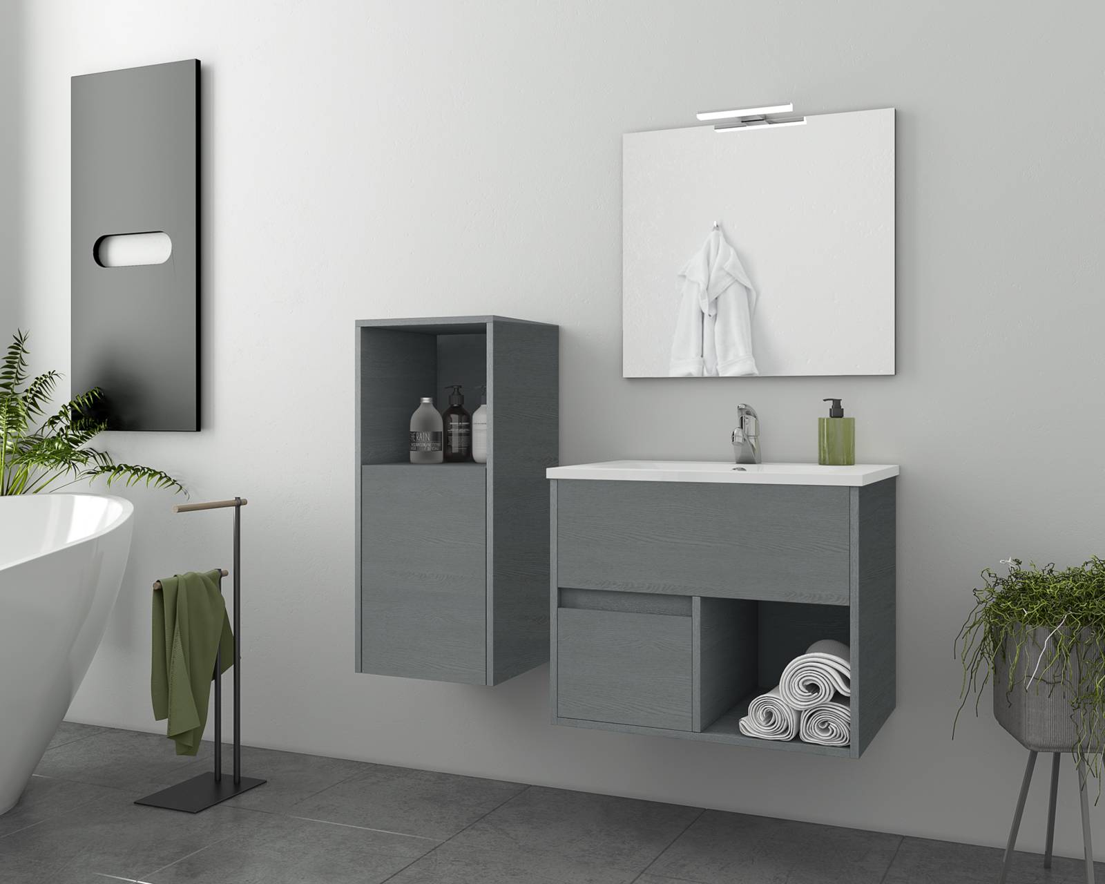 Έπιπλο μπάνιου SET Drop της σειράς Elegance μοντέλο SORENTO 65 Graphite Wood Finish 65cm & Mirror Wall. Κρεμαστή βάση επίπλου, 3 αποθηκευτικοί χώροι 2 συρτάρια 1 ράφι, νιπτήρας πορσελάνης, καθρέπτης κρεμαστός με πλαίσιο από Graphite Wood Finish και ένα φωτιστικό. Μοντέρνες λύσεις που ξεχωρίζουν, για ένα μπάνιο με προσωπικότητα.