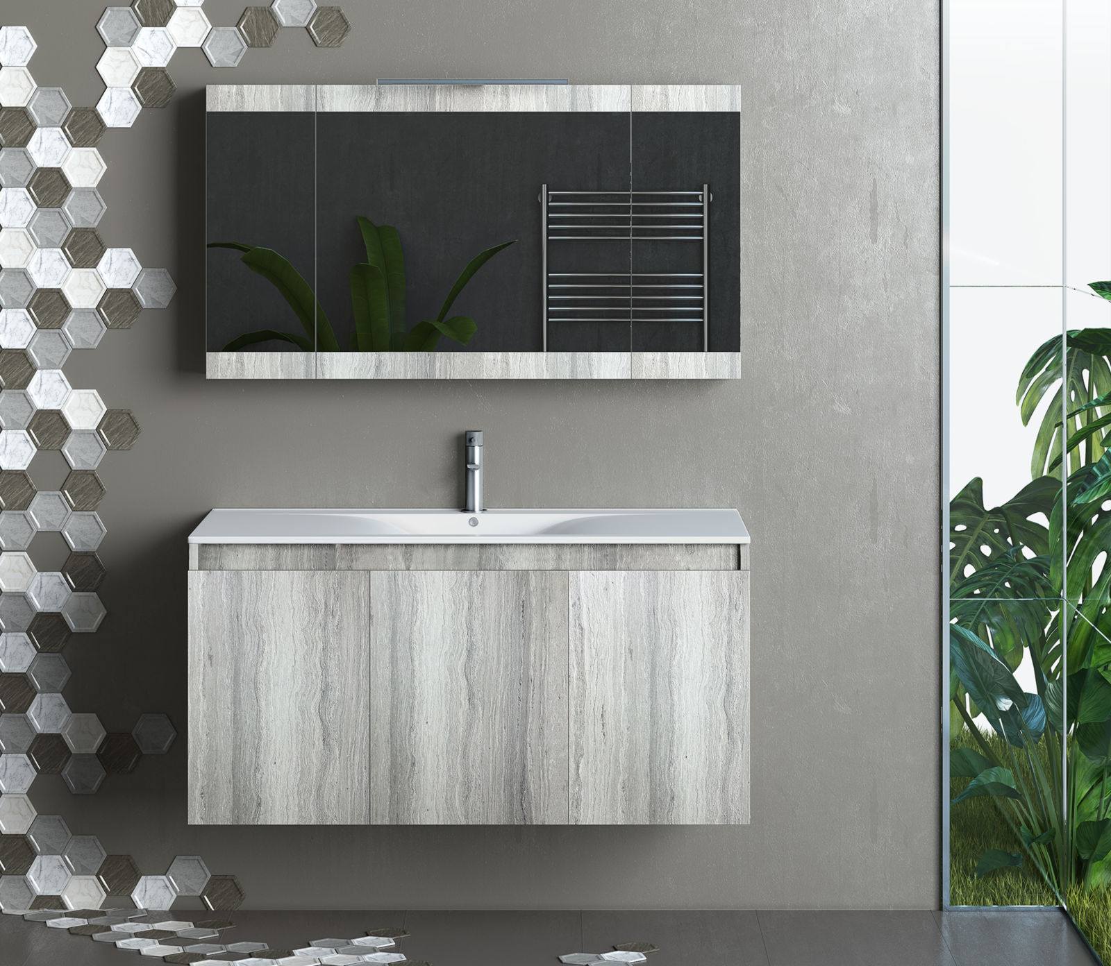 Έπιπλο μπάνιου SET Drop της σειράς Supreme μοντέλο MAGNOLIA S 90 Rock OAK 90cm & Mirror Wall. Κρεμαστή βάση επίπλου, τρεις αποθηκευτικοί χώροι δύο πόρτες, νιπτήρας πορσελάνης, καθρέπτης κρεμαστός με δύο αποθηκευτικούς χώρους, πλαίσιο από Rock OAK και ένα φωτιστικό. Μοντέρνες λύσεις που ξεχωρίζουν, για ένα μπάνιο με προσωπικότητα.