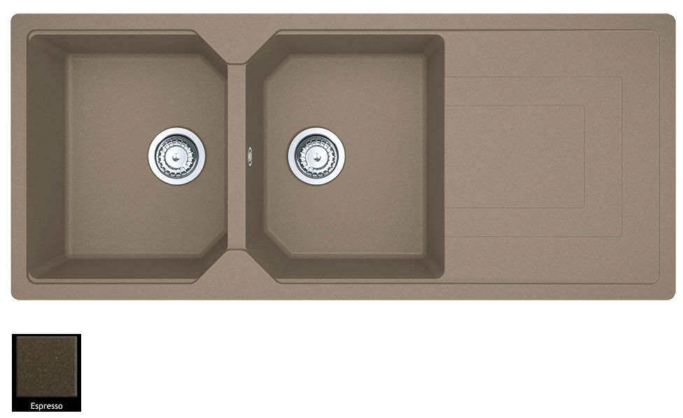 Ένθετος νεροχύτης ορυκτού γρανίτη με δύο συμμετρικές γούρνες και ποδιά, Carron Phoenix μοντέλο: ARUBA 6210 Espresso 116x50 cm. Διατίθεται επιπλέον σε αποχρώσεις Graphite, Oyster, Ivory, Black, Cappuccino, Silver Stone, Beige & White. Μια πλήρης γκάμα νεροχυτών, που διακρίνονται για την εξαιρετική τους αντοχή, την υψηλή ποιότητα και τα φυσικά χρώματα, συνδυάζουν άψογα την κομψότητα και την εργονομία.