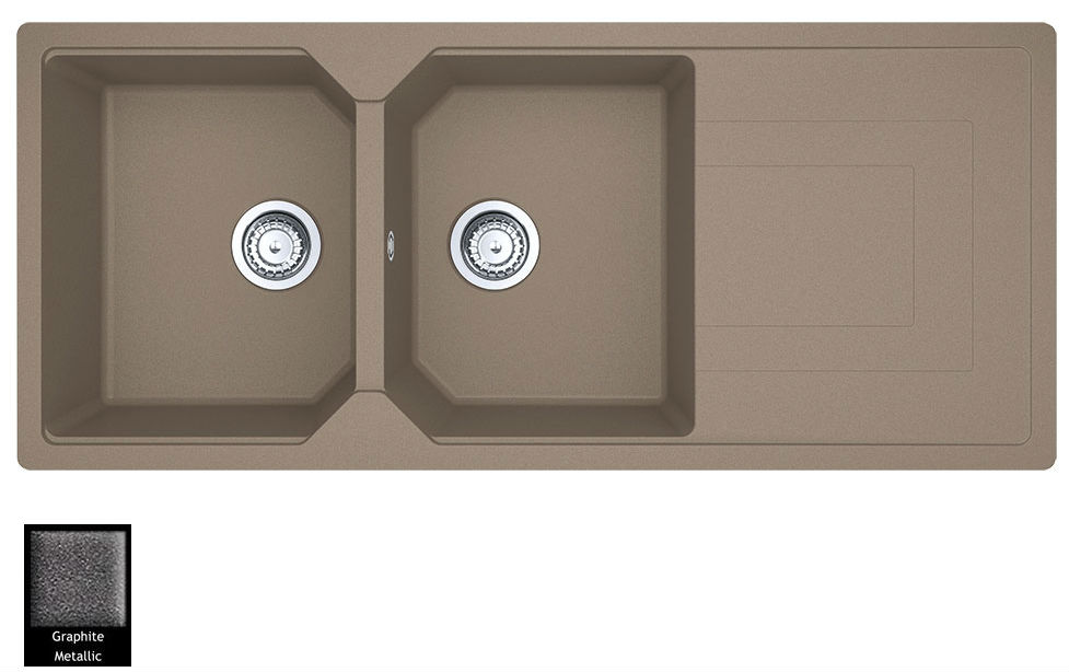 Ένθετος νεροχύτης ορυκτού γρανίτη με δύο συμμετρικές γούρνες και ποδιά, Carron Phoenix μοντέλο: ARUBA 6210 Graphite 116x50 cm. Διατίθεται επιπλέον σε αποχρώσεις Espresso, Oyster, Ivory, Black, Cappuccino, Silver Stone, Beige & White. Μια πλήρης γκάμα νεροχυτών, που διακρίνονται για την εξαιρετική τους αντοχή, την υψηλή ποιότητα και τα φυσικά χρώματα, συνδυάζουν άψογα την κομψότητα και την εργονομία.