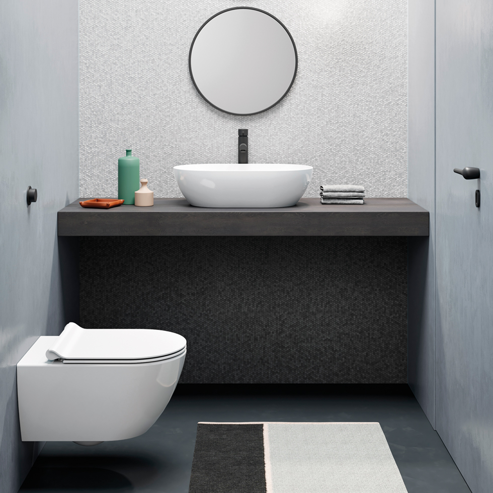 Λεκάνη WC κρεμαστή πορσελάνης υψηλής ποιότητας, GSI σειρά PURA Rimless® 882100SC Λευκό γυαλιστερό 55x36 cm, με κάλυμμα βακελίτη SLIM soft close MS86SC αποσπώμενο, επίσης διατίθεται με κάλυμμα soft close MS99C και το κάλυμμα - μπιντέ soft close USPA 6035RU . Το έπιπλο μπάνιου ο νιπτήρας η μπαταρία κι καθρέπτης δεν συμπεριλαμβάνονται στην τιμή. Άριστη ποιότητα που εξασφαλίζει την απαιτούμενη αντοχή και διαχρονικότητα.