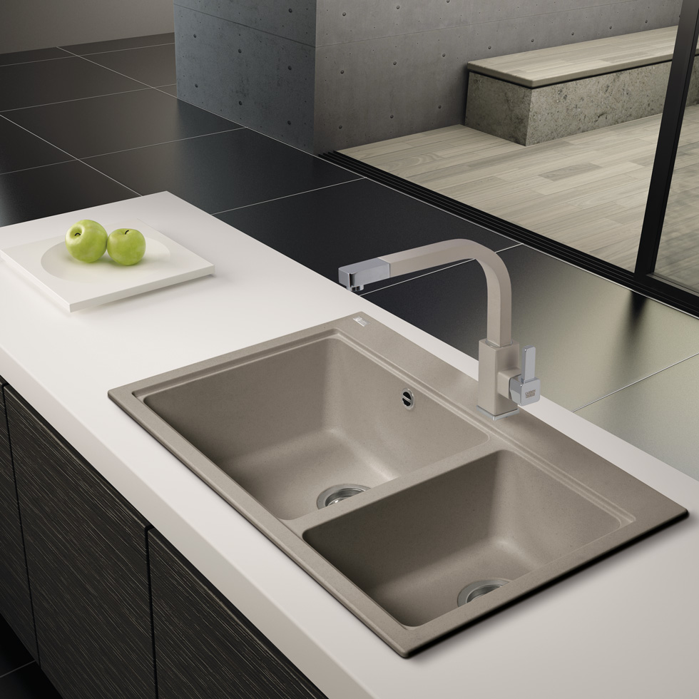 Ένθετος νεροχύτης ορυκτού γρανίτη με δύο ασύμμετρες γούρνες χωρίς ποδιά, Carron Phoenix μοντέλο: FIJI 5200 Oyster 80x52 cm. Διατίθεται επιπλέον σε αποχρώσεις Cappuccino, Espresso, Beige, Ivory, Graphite, White & Silver Stone. Μια πλήρης γκάμα νεροχυτών, που διακρίνονται για την εξαιρετική τους αντοχή, την υψηλή ποιότητα και τα φυσικά χρώματα, συνδυάζουν άψογα την κομψότητα και την εργονομία. Η μπαταρία και ο πάγκος δεν συμπεριλαμβάνονται στην τιμή