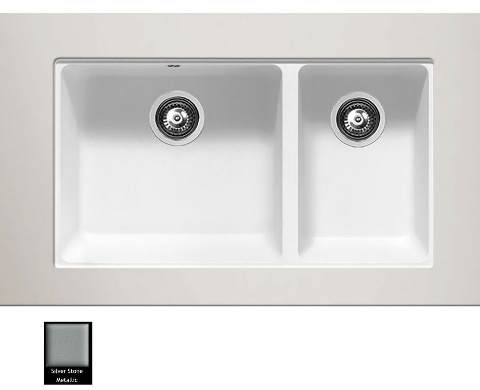 Υποκαθήμενος νεροχύτης ορυκτού γρανίτη με δύο ασύμμετρες γούρνες χωρίς ποδιά, Carron Phoenix μοντέλο: FIJI 5200U Silver Stone 80x46 cm. Διατίθεται επιπλέον σε αποχρώσεις White, Cappuccino, Graphite & Oyster. Μια πλήρης γκάμα νεροχυτών, που διακρίνονται για την εξαιρετική τους αντοχή, την υψηλή ποιότητα και τα φυσικά χρώματα, συνδυάζουν άψογα την κομψότητα και την εργονομία.