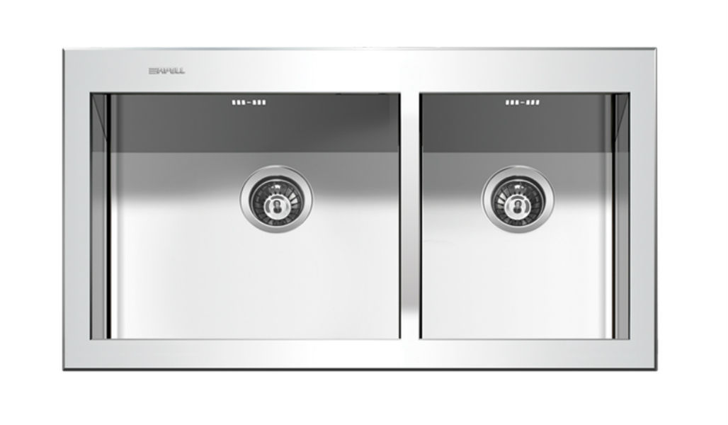 Ανοξείδωτος ένθετος νεροχύτης αθόρυβος με δύο ασύμμετρες γούρνες χωρίς ποδιά, INOX SATIN λείο της APELL μοντέλο: AMALTHEA 9625 86x51 cm. Υψηλής ποιότητας κράμα χάλυβα (18/10). Σχεδιαστικές καινοτομίες με διεθνείς βραβεύσεις, ιταλική φινέτσα για την κουζίνα σας από την APELL.