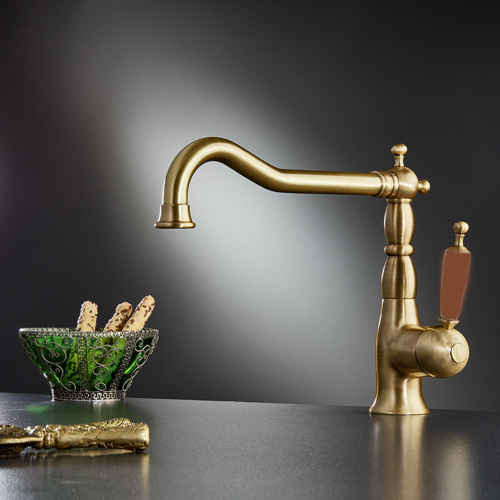 Μπαταρία κουζίνας retro με μακρύ περιστρεφόμενο ρουξούνι, φινίρισμα Bronze / ξύλο, BUGNATESE OXFORD 6382. Όλες οι σειρές των μπαταριών BUGNATESE έχουν σχεδιαστεί για να σέβονται την αισθητική και το περιβάλλον. Όλα τα προϊόντα έχουν ιδανική σχέση ποιότητας – τιμής.