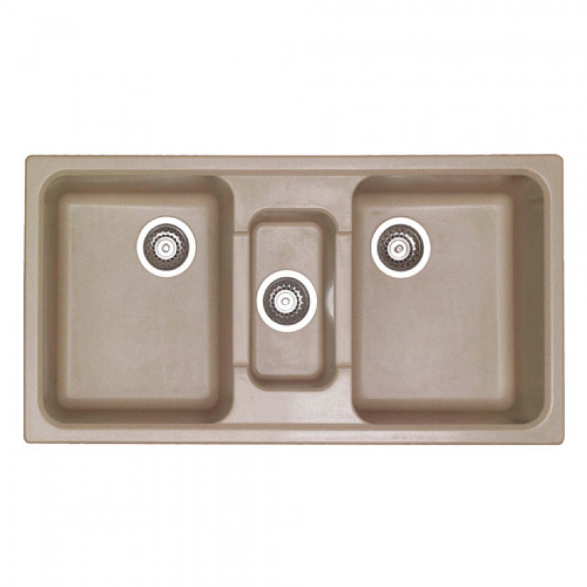 Νεροχύτης συνθετικός γρανίτη ένθετος, δύο γούρνες μεγάλες συμμετρικές και μία μικρή, SANITEC μοντέλο: Harmony 325 Metallic Beige (97x51 cm) διατίθεται σε όλες τις αποχρώσεις του χρωματολογίου. Οι συνθετικοί νεροχύτες παράγονται από την SANITEC εδώ και πολλά έτη, σε διάφορους εργονομικούς σχεδιασμούς, λειτουργικές φόρμες και σε μεγάλη ποικιλία χρωμάτων (με εμφάνιση «γρανίτη» & «μεταλλιζέ»).