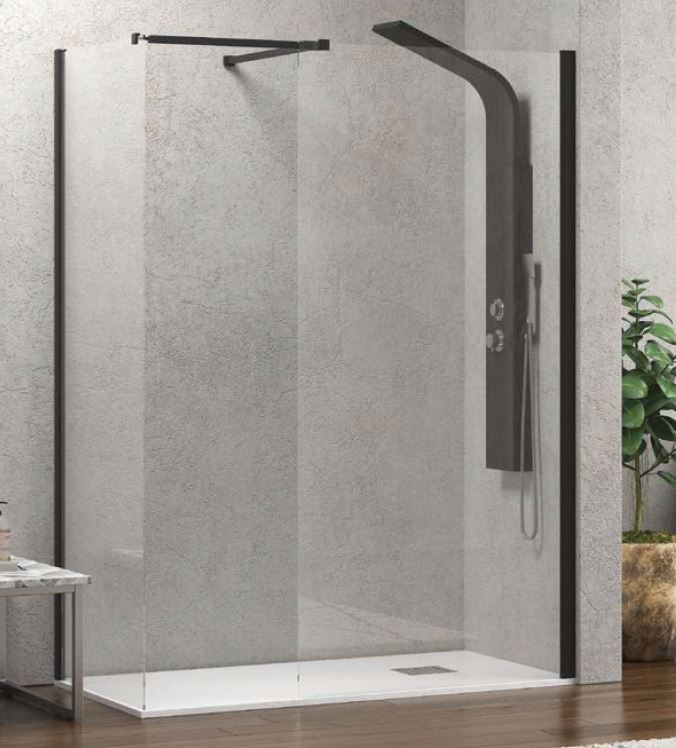 Διαχωριστικό καμπίνα ντουζιέρας σταθερό πάνελ ελεύθερης τοποθέτησης, Karag μοντέλο WALKIN 2 NERO MATT 90cm, ύψος 200cm κρύσταλλο ασφαλείας 8 mm Tempered διαφανές, μεταλλική τηλεσκοπική αντηρίδα στήριξης μεταλλικά μέρη προφίλ μαύρο ματ. Στην τιμή δεν συμπεριλαμβάνεται η ντουζιέρα και η στήλη ντους