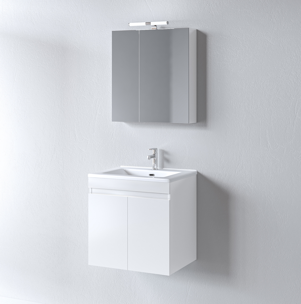 Μοντέρνο έπιπλο μπάνιου σετ της MARTIN σειρά OMEGA μοντέλο WHITE 65. Κρεμαστή βάση επίπλου, με ενιαίους αποθηκευτικούς χώρους, νιπτήρας πορσελάνης, καθρέπτης κρεμαστός και φωτιστικό. Η σύνθεση Omega εκφράζει την τέλεια αντίθεση πολυτελούς και απλού. Η σειρά Omega ακολουθεί τη σύγχρονη λογική των επίπλων χωρίς πόμολα προσφέροντας έναν κόσμο εργονομίας και δημιουργικών λύσεων. H κρεμαστή στήλη, το φωτιστικό και η μπαταρία δεν συμπεριλαμβάνεται στην τιμή.