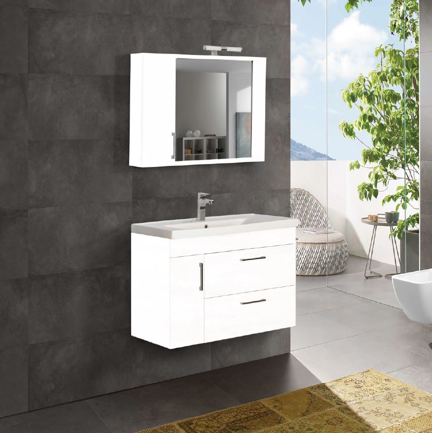 Μοντέρνο έπιπλο μπάνιου σετ της MARTIN σειρά IBIZA μοντέλο WHITE 80. Κρεμαστή βάση επίπλου, με τρείς αποθηκευτικούς χώρους, νιπτήρας πορσελάνης, καθρέπτης κρεμαστός και φωτιστικό. Η σύνθεση Ibiza εκφράζει την τέλεια αντίθεση πολυτελούς και απλού. Η σειρά Ibiza ακολουθεί τη σύγχρονη λογική των επίπλων χωρίς πόμολα προσφέροντας έναν κόσμο εργονομίας και δημιουργικών λύσεων. H στήλη, το φωτιστικό και η μπαταρία δεν συμπεριλαμβάνεται στην τιμή.