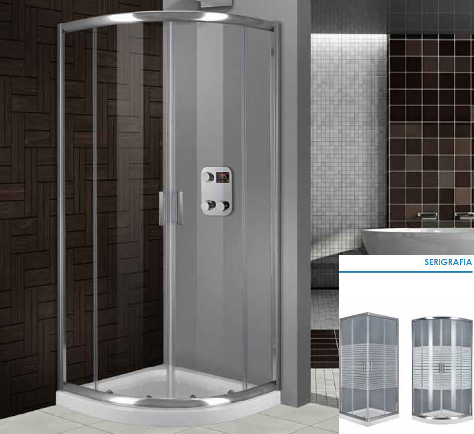 Καμπίνα ντουζιέρας ημικυκλική Aquarelle μοντέλο Venia 20, 90x90xh 185 cm, κρύσταλλο ασφαλείας Tempered 5 mm σχέδιο Serigrafia, αφαλατική επεξεργασία Aqua Clean System, διατίθεται και σε clear, mat, mat middle & mat stripes, μεταλλικά μέρη αλουμινίου Chrome Mirror. Στην τιμή δεν συμπεριλαμβάνεται το Aquarelle Art η ντουζιέρα και η στήλη ντους.