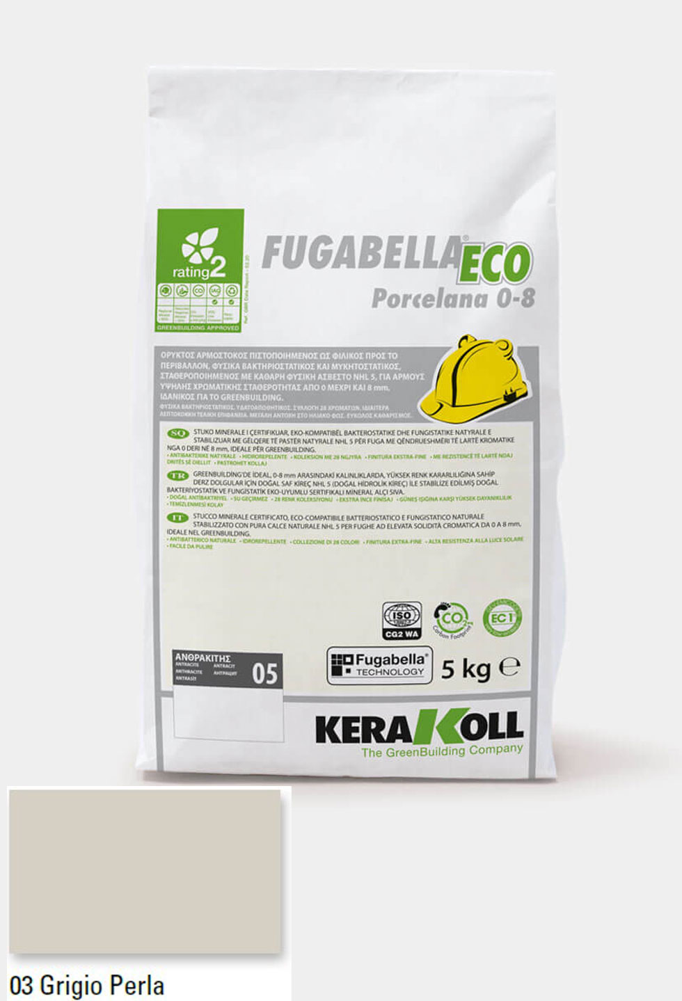 Ορυκτός αρμόστοκος, πιστοποιημένος, φιλικός προς το περιβάλλον, φυσικά βακτηριοστατικός και μυκητοστατικός σταθεροποιημένος με καθαρή φυσική άσβεστο NHL 5, KERAKOLL Fugabella Eco Porcelana 0‑8 Grigio Perla 03 συσκευασία 5kgr, για αρμούς υψηλής χρωματικής σταθερότητας από 0 μέχρι και 8 mm, ιδανικός για το GreenBuilding.