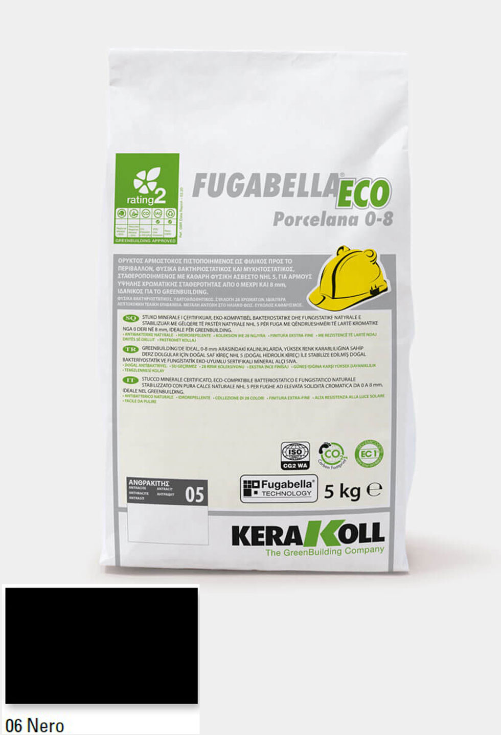 Ορυκτός αρμόστοκος, πιστοποιημένος, φιλικός προς το περιβάλλον, φυσικά βακτηριοστατικός και μυκητοστατικός σταθεροποιημένος με καθαρή φυσική άσβεστο NHL 5, KERAKOLL Fugabella Eco Porcelana 0‑8 Nero 06 συσκευασία 5kgr, για αρμούς υψηλής χρωματικής σταθερότητας από 0 μέχρι και 8 mm, ιδανικός για το GreenBuilding.