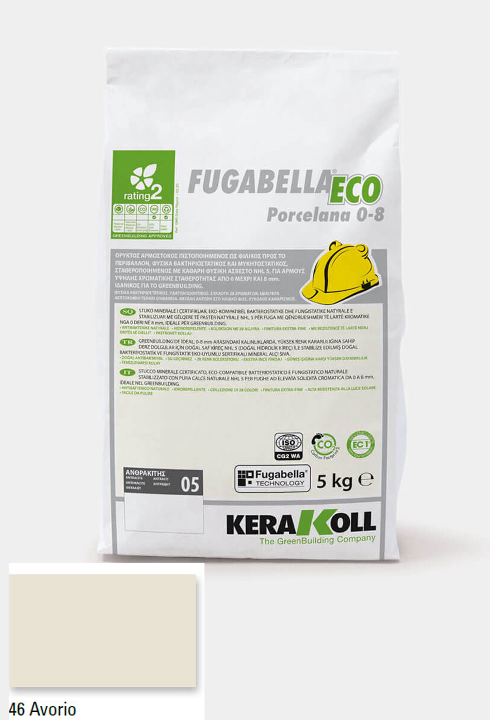 Ορυκτός αρμόστοκος, πιστοποιημένος, φιλικός προς το περιβάλλον, φυσικά βακτηριοστατικός και μυκητοστατικός σταθεροποιημένος με καθαρή φυσική άσβεστο NHL 5, KERAKOLL Fugabella Eco Porcelana 0‑8 Avorio 46 συσκευασία 5kgr, για αρμούς υψηλής χρωματικής σταθερότητας από 0 μέχρι και 8 mm, ιδανικός για το GreenBuilding.