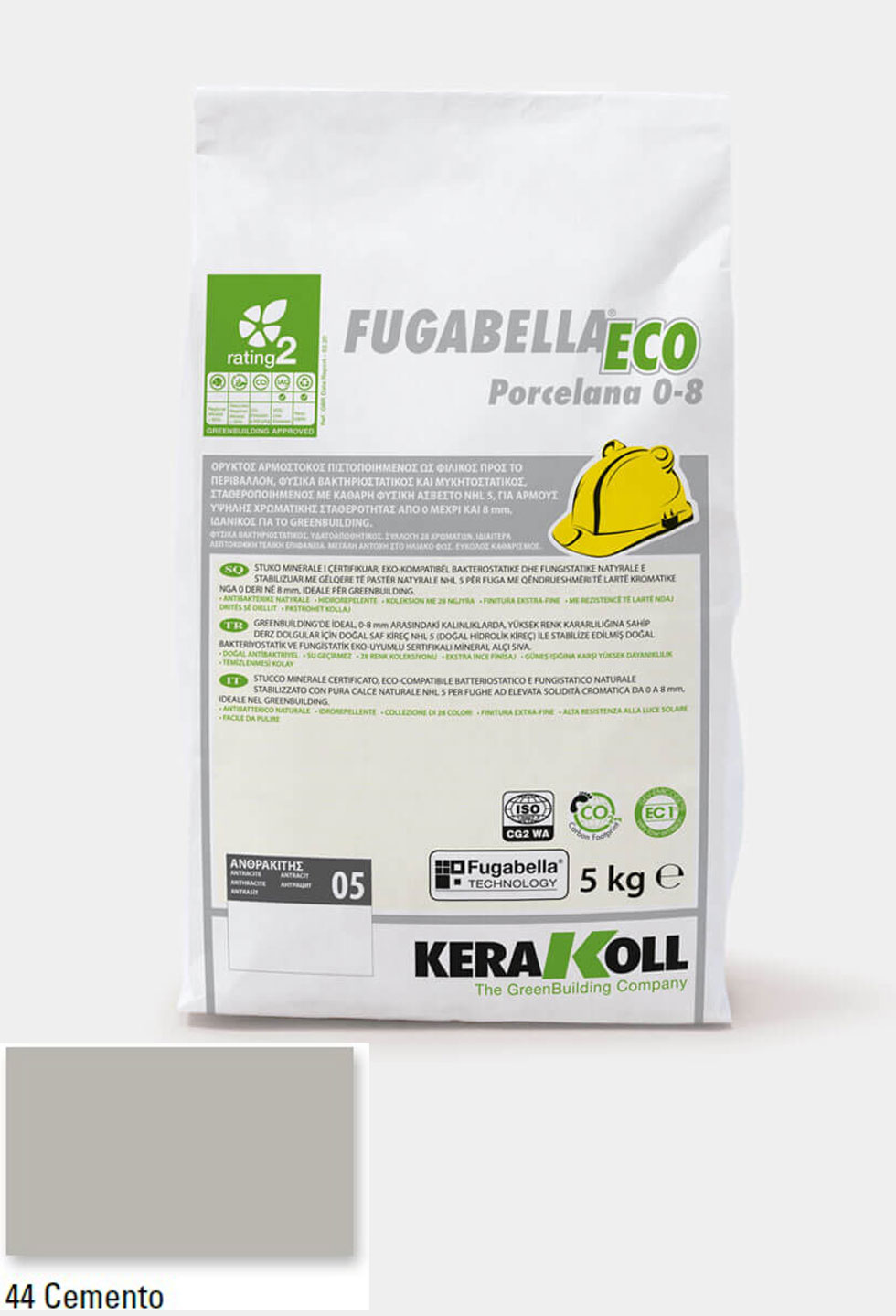 Ορυκτός αρμόστοκος, πιστοποιημένος, φιλικός προς το περιβάλλον, φυσικά βακτηριοστατικός και μυκητοστατικός σταθεροποιημένος με καθαρή φυσική άσβεστο NHL 5, KERAKOLL Fugabella Eco Porcelana 0‑8 Cemento 44 συσκευασία 5kgr, για αρμούς υψηλής χρωματικής σταθερότητας από 0 μέχρι και 8 mm, ιδανικός για το GreenBuilding.