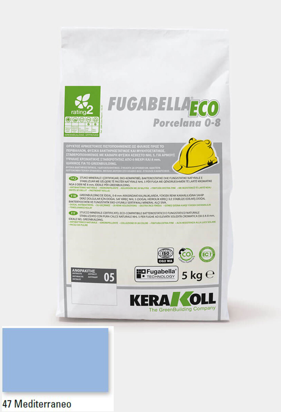 Ορυκτός αρμόστοκος, πιστοποιημένος, φιλικός προς το περιβάλλον, φυσικά βακτηριοστατικός και μυκητοστατικός σταθεροποιημένος με καθαρή φυσική άσβεστο NHL 5, KERAKOLL Fugabella Eco Porcelana 0‑8 Mediterraneo 47 συσκευασία 5kgr, για αρμούς υψηλής χρωματικής σταθερότητας από 0 μέχρι και 8 mm, ιδανικός για το GreenBuilding.
