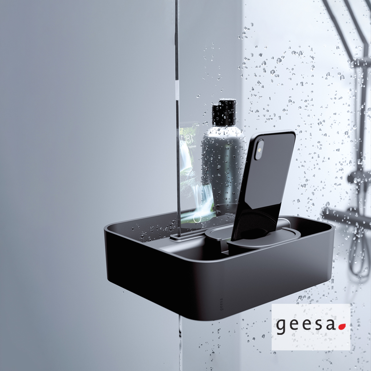 Μπουκαλοθήκη τοίχου με θέση στήριξης τηλεφώνου, για ανάρτηση σε κρυστάλλινο διαχωριστικό ντους, διάσταση Π20,8 x Β23,3 - H10,6 εκ, GEESA της σειράς FRAME, φινίρισμα Black Matt. Η εταιρεία GEESA μας προσφέρει μια πλούσια γκάμα από αξεσουάρ μπάνιου. Μοντέρνου, κλασσικού αλλά και διαχρονικού στυλ από άριστης ποιότητας ορείχαλκο μπρούτζο που θα σας καταπλήξουν.
