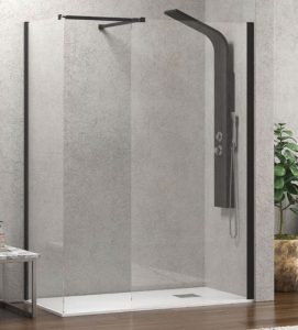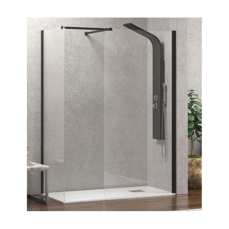 Διαχωριστικό καμπίνα ντουζιέρας σταθερό πάνελ ελεύθερης τοποθέτησης, Karag μοντέλο WALKIN 2 NERO MATT 140cm, ύψος 200cm κρύσταλλο ασφαλείας 8 mm Tempered διαφανές, μεταλλική τηλεσκοπική αντηρίδα στήριξης μεταλλικά μέρη προφίλ μαύρο ματ. Στην τιμή δεν συμπεριλαμβάνεται η ντουζιέρα και η στήλη ντους